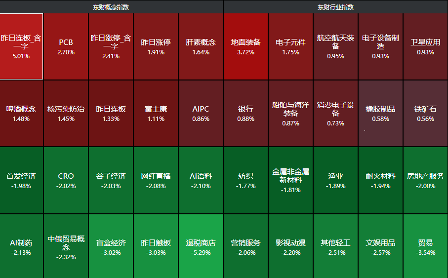 上证报中国证券网讯截至6月18日午间收盘华夏国际,沪指跌0.2%,深成指跌0.15%,创业板跌0.36%。算力硬件股逆势走强,PCB等方向领涨,逸豪新材、中京电子涨停。军工、银行等板块涨幅居前。下跌方面,创新药概念持续走低,谷子经济、AI预料等概念股跌幅靠前。